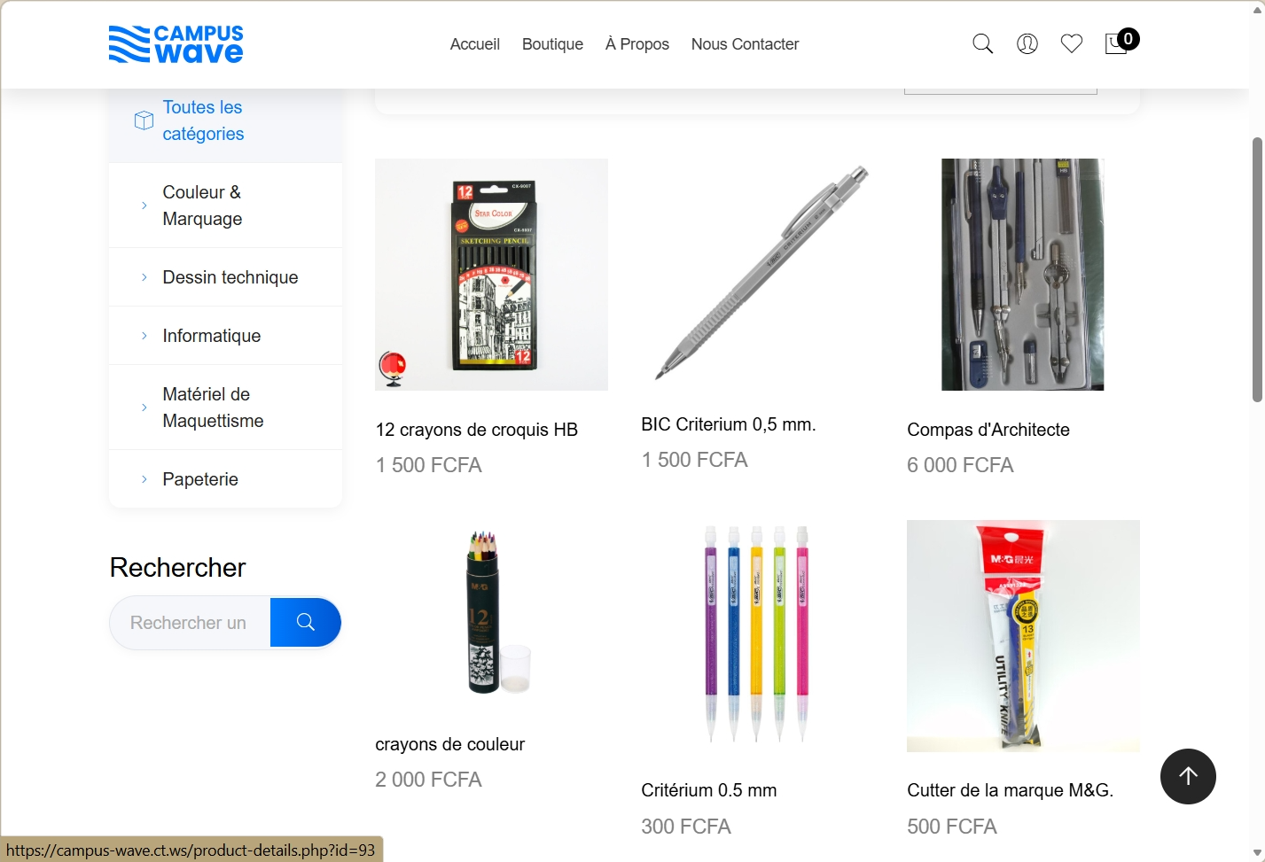 La plateforme met à disposition un catalogue varié (papeterie, dessin technique, matériel informatique, etc.), tout en offrant la possibilité de bénéficier de réductions étudiantes et d’un stock déjà disponible sur place. Grâce à cette approche, Campus Wave réduit les coûts, simplifie l’accès aux fournitures essentielles et crée un pont entre les étudiants et les fournisseurs.