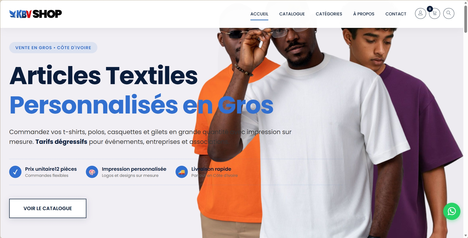 KBV SHOP est une boutique en ligne développée pour une imprimerie ivoirienne spécialisée dans les vêtements personnalisés en grande quantité. Le site propose un catalogue varié (t-shirts, polos, casquettes, gilets, chaussures de sécurité) avec tarifs dégressifs pour les entreprises, associations et organisateurs d’événements.